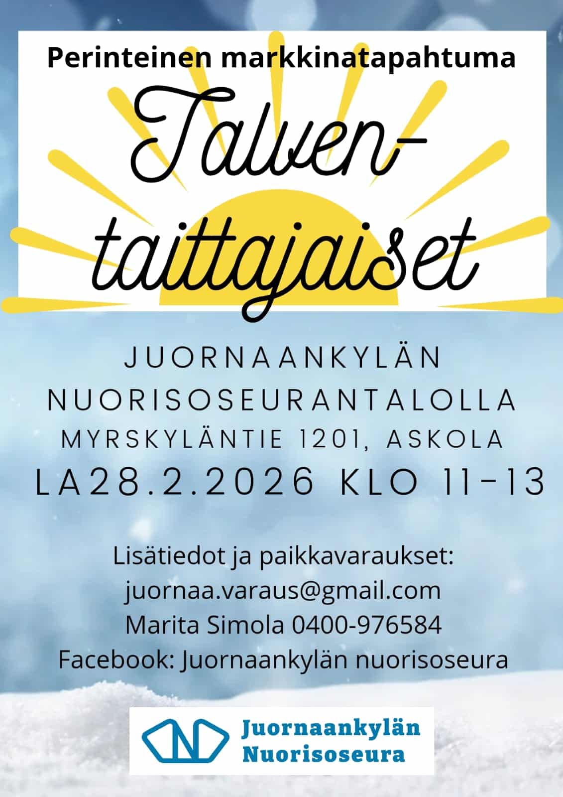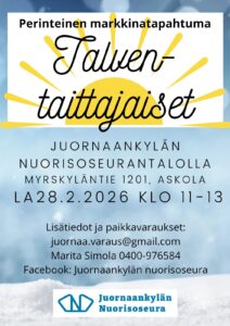 Talventaittajaiset Milloin 28.2.2026 11:00 - 13:00 Lisää kalenteriisi Download ICS Google Calendar iCalendar Office 365 Outlook Live